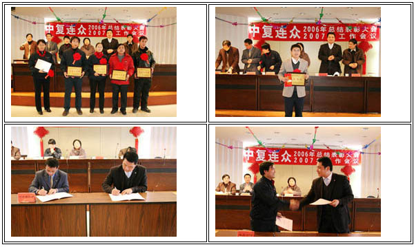 2007年元月31日下午,中复连众2006年总结表彰大会暨2007年工作会议在集团公司办公大楼五楼多功能厅召开,公司全体员工参加了会议。会上,乔光辉总经理总结了2006年工作,布置了2007年工作任务,陈立友主席宣读了关于《表彰2006年度先进个人、标兵、先进集体的决定》,由集团公司领导颁发了奖金、奖牌。为了做好07年的工作,乔光辉总经理同各子分公司、事业部签订2007年经营责任书。最后,中复集团公司副总经理、天行官方在线入口党委书记、董事长任总作了重要讲话,由耿婷芳副总经理作会议总结。图为公司领导与各事业部主要负责人签订2007年经营责任书与公司领导为标兵等颁奖的照片。